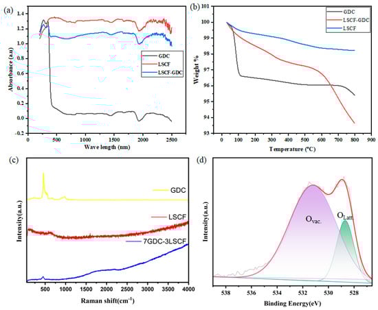 (a) UV-Visible absorbance spectra of pure LSCF, GDC, and LSCF-GDC heterostructure composites; (b) thermogravimetric analysis of LSCF, GDC, and LSCF-GDC; (c,d) Raman spectra of LSCF, GDC, and LSCF-GDC, and XPS O1s spectrum of the LSCF-GDC heterostructure composite, where black line shows the measured data and red line shows the fitted data, respectively.