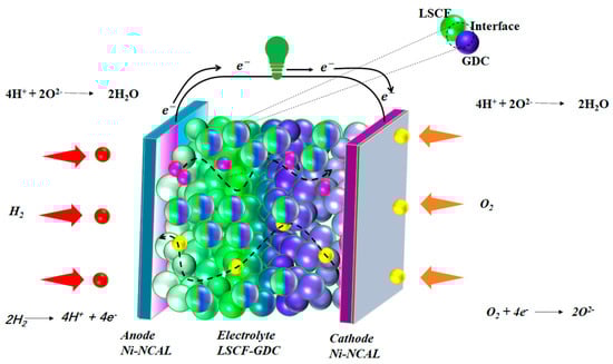 The different electrochemical mechanisms and processes involved in fuel cells with LSCF-GDC electrolyte-based fuel cells in producing power output based on an ionic transport membrane, where green ball shows the LSCF-GDC particle at anode and purple balls shows the LSCF-GDC at cathode side.