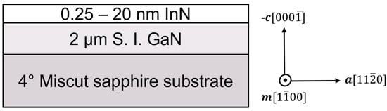 The III-nitride semiconductor system of GaN, AlN, and InN is a promising platform for next-generation electronics due to its favorable material properties such as high electron mobilities, high thermal conductivities, and high breakdown voltages. InN, which is normally utilized for InGaN-based visible and ultraviolet optoelectronics [,,,], has interesting electrical properties. These properties include a low electron effective mass of 0.07 m0, leading to the highest theoretical mobilities of the III-nitrides of up to 14,000 cm2 V−1 s−1 at 300 K and the highest electron saturation drift velocity of the III-nitrides [,]. InN also features a high electron surface accumulation [], which has applications in chemical sensing [,]. These electrical properties make InN an intriguing choice for electronic devices.
