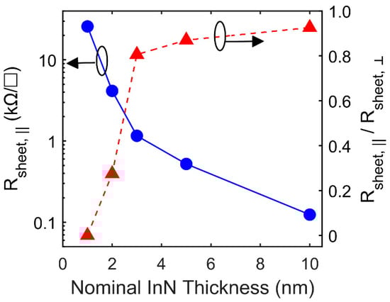 While the AFM imaging of the InN surface morphologies visually indicated wire-like structures, the electrical measurements elucidated the extent of 1D electrical conduction in the wire-like samples and determined the practicality of such structures for electronic devices. Figure 5 shows the sheet resistances of fabricated InN samples extracted from TLM measurements. TLM measurements were taken along the direction of the wire segments (a) and perpendicular to the direction of the wire segments (m). The ratio of sheet resistance in the directions parallel and perpendicular to the wire segment direction indicated the onset of more 1D conduction—a ratio closer to one suggested more 2D conduction indicative of a quantum well, and a lower ratio suggested 1D conduction as the sheet resistance in the direction of the wire segments became much lower than the sheet resistance perpendicular to the wire segments. As depicted in Figure 5, the sheet resistance ratio significantly dropped below 1 for InN thicknesses of 2 nm and lower, confirming the observations of the surface morphology from the AFM images. The 1 nm thick InN sample was fully non-conductive perpendicular to the wire segment direction, suggesting a high extent of 1D conduction. The sheet resistances of truly wire-like samples with 1–1.5 nm InN ranged from 10—25 kΩ/□. While the measured TLM sheet resistances of the wire-like samples were in the kΩ/□ range, the thicker InN films were much less resistive. As seen in Figure 5, the 10 nm thick film sample had a TLM sheet resistance of 132 Ω/□. The measured Hall data of the 20 nm thick InN included a sheet carrier concentration of 1.1 × 1014 cm−2 and electron mobility of 397 cm2 V−1 s−1, giving a low sheet resistance of 142 Ω/□. Note that all samples with InN dashes rather than wire segments were resistive. These results indicated that thicker N-polar InN films grown by MOCVD had good quality and properties. The rather high sheet resistances measured for the InN wire-like samples likely originated from the required narrow InN thickness window to form 1D wire segments on the GaN template. As the InN must be only 1–2 nm thick for wire segment formation, dislocations forming at the InN/GaN interface were in close proximity to the wire segments, thereby amplifying the effects of electron scattering from the interfacial dislocations. It had been previously observed that the electron mobility in InN decreased for thin layers with decreasing layer thicknesses because of scattering by misfit dislocations forming at the InN/GaN interface []. In addition, InN wire segment thickness variations may affect the sheet resistance values. In order to reduce the sheet resistance of InN quantum wire segments, the interfacial dislocation density could be reduced by the growth of the InN on base layers with a lattice constant closer to that of InN, such as relaxed InGaN.