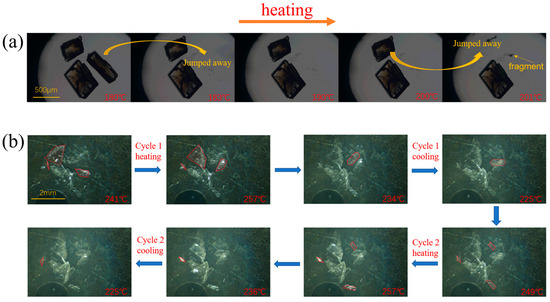 - Omoto, K.; Nakae, T.; Nishio, M.; Yamanoi, Y.; Kasai, H.; Nishibori, E.; Mashimo, T.; Seki, T.; Ito, H.; Nakamura, K.; et al. Thermosalience in Macrocycle-Based Soft Crystals via Anisotropic Deformation of Disilanyl Architecture. J. Am. Chem. Soc. 2020, 142, 12651–12657. [Google Scholar] [CrossRef]