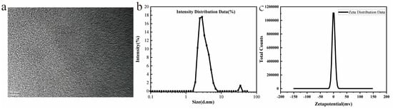 As depicted in Figure 1b, the particle size distribution of the sample solution was determined using two distinct techniques: DLS and TEM. The measured particle size distribution via DLS appeared relatively larger than that via TEM, which can be attributed to the amount of solvent in the sample in the DLS measurements. Notably, the hydrated particle diameters measured via DLS indicated the presence of surface groups in the sample solution, which likely contributed to its good water solubility [].