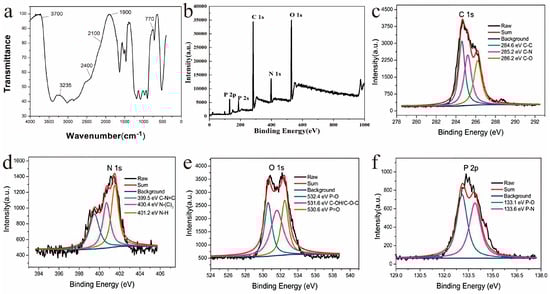 FTIR spectra (a), XPS full spectra (b), C 1s spectra (c), N 1s spectra (d), O 1s spectra (e), and P 2p spectra (f) of RTPL materials.