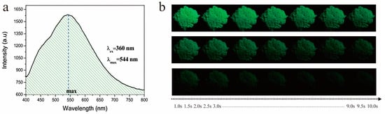 The long afterglow luminous material exhibits different properties in its solution and solid states. In natural light, the material appears brown in solution and light yellow in its solid form. When exposed to UV lamp radiation, the dissolved material does not emit light, while the solid state material exhibits blue fluorescence. When the UV lamp is turned off, the solid state material emits green phosphorescence. Figure 3a displays the phosphorescence emission spectrum of the prepared long afterglow luminescent material. When excited with UV light at 360 nm, the material emits phosphorescence, with the highest intensity at 544 nm. This indicates that the material possesses excitation-dependent phosphorescence properties. Moreover, under observation with the naked eye, the solid-state long afterglow luminescent material shows a clear and distinct green phosphorescence that lasts for approximately 10 s after UV light irradiation has stopped, as shown in Figure 3b.