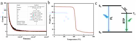 Phosphorescence decay curves for long afterglow materials (a), thermo-gravimetric analysis (TGA) curves (b), and a schematic of the room temperature phosphorescence (RTP) emission mechanism (the absorption process is omitted and the width of the emission line is used to roughly represent the intensity of fluorescence or room temperature phosphorescence emission) (c).