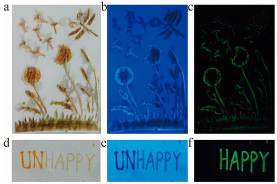 Figure 5d–f demonstrates the use of long afterglow luminescent material ink as a special encryption ink. Brown dye and RTPL materials were used to write on A4 printing paper with a calligraphy pen. After drying, photographs were taken under natural light and a 360 nm UV light, respectively. When using fluorescent ink with a similar color on ordinary A4 paper to write “UN” and long afterglow luminescent material ink to write “HAPPY”, observation with the naked eye of the two colors is almost the same. However, when irradiated with an ultraviolet lamp, the blue fluorescent “UNHAPPY” can be observed, and only when the ultraviolet lamp is turned off can the green phosphorescent-encrypted information “HAPPY” be seen. This achieves the role of information encryption and decryption, indicating that the produced long afterglow ink can be used as a special encryption ink.