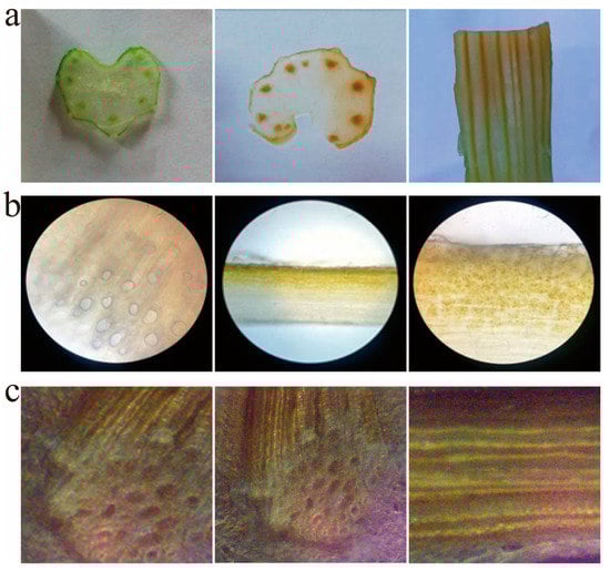 Stems of celery soaked in a long afterglow material solution. Photographs of transverse and longitudinal sections (a), microscopic images in daylight (b), and microscopic images of vascular bundles after immediate cessation of excitation by UV light (c).