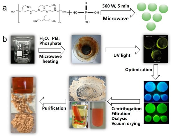 In this study, we have synthesized room temperature long afterglow luminescent materials in a single step using PEI and phosphoric acid with microwave-assisted heating. The use of PEI and phosphoric acid as nitrogen and phosphorus sources, respectively, is favorable for the n→π* leap in the system, facilitating the filling of the triplet state inter-system crossover (ISC). Synthesis methods of organic room temperature phosphorescent materials mainly include the hydrothermal method, the template method, the pyrolysis method, and the microwave-assisted heating method. Water/solvothermal methods are when the solvents used in the system can affect the photoluminescence performance of the material []. The disadvantage of the template method is that the strong acids/bases used during the template removal process can affect the luminescent performance of RTPL materials []. The surface of RTPL materials synthesized via the pyrolysis method contains fewer functional groups, resulting in a decrease in luminescent performance []. The microwave-assisted heating method has significant advantages in this process compared with other synthetic methods. Microwave heating permits efficient heating and mixing in a brief amount of time, thereby expediting the synthesis of nanomaterials. It is a non-thermal equilibrium process with localized heating and selective heating that can synthesize nanomaterials of varying sizes, morphologies, and physicochemical properties under varying reaction conditions. In addition, microwave heating can uniformly heat the sample, thereby improving the uniformity and consistency of the synthesized nanomaterials. In terms of cost-effectiveness, microwave synthesis is an energy saving technique that can considerably reduce the reaction time and temperature as well as the energy consumption of chemical reactions and process pollution []. As a result, the microwave synthesis method has gained significant interest in the field of room temperature phosphorescent material preparation and has been widely used in recent years.