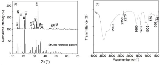 - International Centre for Diffraction Data, Ammonium Magnesium Phosphate Hydrate (Standard #15-0762), A Computer Database. 1996. Available online: https://www.icdd.com (accessed on 25 March 2023).