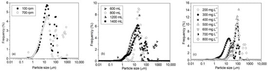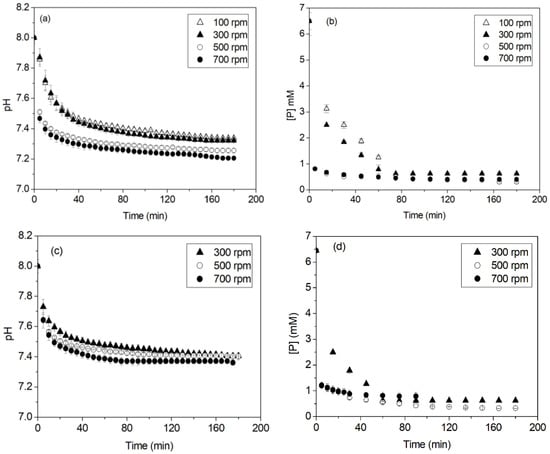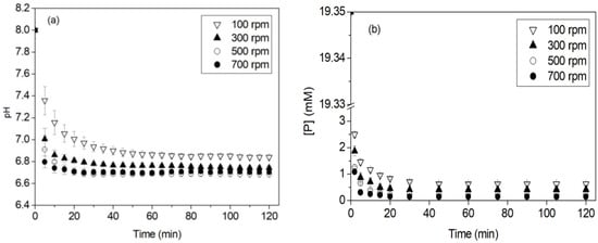- For an initial phosphorus concentration of 200 mg·L−1, as the stirring rate increased from 100 to 500 rpm, the initial precipitation rate increased, the precipitation end time decreased, the phosphorus removal efficiency increased from 90% to 95%, respectively, and struvite particle size increased.