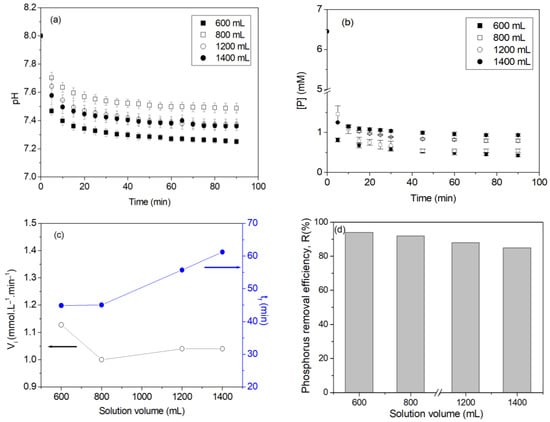 - At a fixed stirring rate and initial phosphorus concentration, the increase in the solution volume decreased the initial precipitation rate, increased the precipitation end time, and decreased the phosphorus removal efficiency.