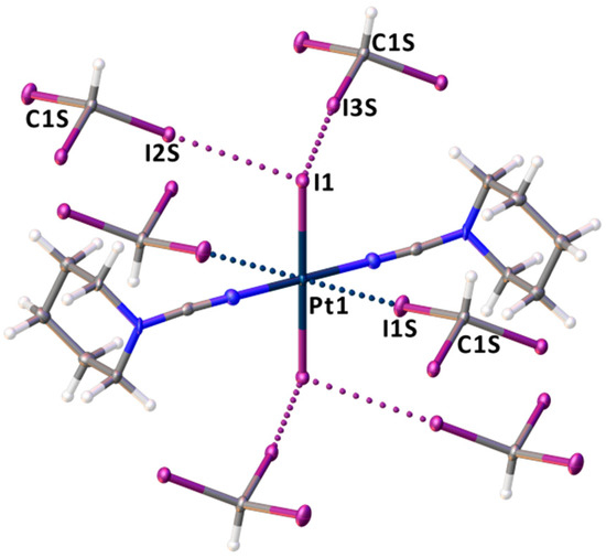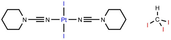 Complex trans-[PtI2(NCN(CH2)5)2] and iodoform were cocrystallized in a molar ratio of 1:2 via the slow evaporation of their dichloromethane/ethylacetate (1:1) mixture at RT. The cocrystallization yielded a crystalline adduct trans-[PtI2(NCN(CH2)5)2]∙2CHI3, the structure of which was studied via single-crystal XRD (Figure 3 and Table S1).
