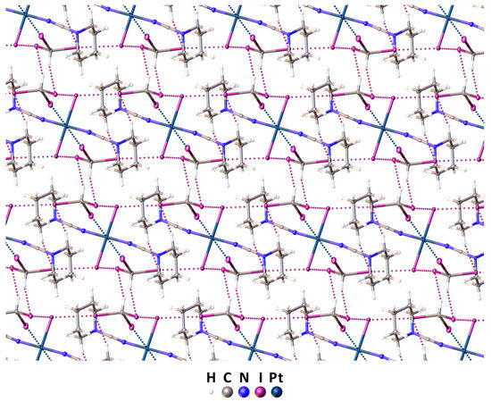 The crystal structure of trans-[PtI2(NCN(CH2)5)2]∙2CHI3 features two molecules of CHI3 per one molecule of trans-[PtI2(NCN(CH2)5)2], where each complex molecule is surrounded by six CHI3 molecules (Figure 4). The molecular structure of trans-[PtI2(NCN(CH2)5)2]∙2CHI3 includes C–I∙∙∙I–Pt short contacts formed between two iodide ligands of 1 and I centers of CHI3, which comprise from 89% to 90% of the vdW radii sum defined by Bondi [94] (ΣvdW; 2RvdW(I) = 3.96 Å) (Figure 4 and Table 1). The angles around the iodine centers of CHI3 are close to 180° and are far from linear around the iodide ligands of 1. In turn, an inspection of the calculated ESP data for trans-[PtI2(NCN(CH2)5)2] (Figure 2) reveals that the minimal ESP (−32.8 kcal/mol) is located on the I atoms of the Pt–I bonds. All these observations indicate the C–I∙∙∙I–Pt short contacts should be treated as XBs defined by IUPAC or as “type II” halogen–halogen interactions [1,95], where the iodide ligands act as nucleophilic centers toward iodoform σ-holes.