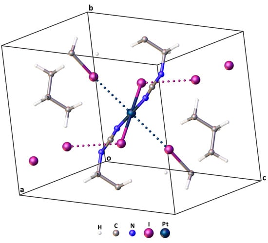 Halogen bonds can be investigated through both experimental and theoretical studies applied to the same objects. In the vast majority of reports on metal-involving XBs, theoretical calculations of intermolecular contacts were carried out for gas-phase model clusters based on atomic coordinates experimentally determined using X-ray diffractometry (XRD) [18,19,21,22,24,25,26,29], while studies using Kohn–Sham calculations with periodic boundary conditions are still quite rare—the only example is one of our previous studies presenting such calculations for three-center Br∙∙∙(Cl−PtII) XBs involving trans-[PtCl2(NCNR2)2] (R = Me2, Et2) complexes [26]. Inspired by the observation of these interactions and the results of the periodic calculations for the XBs, we decided to expand this area. We started with the identification of new metal-involving XB with dialkylcyanamide platinum(II) complexes.