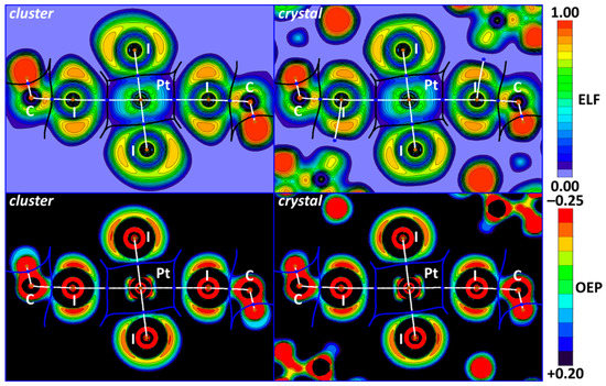 In the cluster and crystal models, the I∙∙∙Pt bond paths (Figure 6) pass through the depletion I ELF areas in the iodoform. These observations confirm the electrophilicity of iodine atoms toward the metal center in the I∙∙∙Pt interactions. The same analysis can be performed for the OEP projections. Notably, the location of critical bond points and the bond paths is the same in both the cluster and crystal models, which indicates the similarity of the nature of noncovalent interactions.