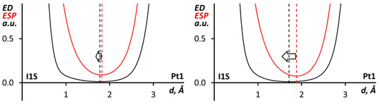 The nucleophilicity of the Pt center toward iodine atoms in CHI3 was also proved through a comparison of the electron density (ED) and electrostatic potential (ESP) profiles along the I∙∙∙Pt bond paths in the cluster models. This analysis [79,100,101], which has already been applied for halogen bonds including metals [18,21,29,30], shows the roles of noncovalent partners since the ED minimum is closer to the electrophile nucleus, the ESP minimum is near the nucleophile nucleus, and the area between the minima corresponds to nucleophile lone pair. Accordingly, in both relativistic and pseudopotential calculations (Figure 7), the ESP minimum along the I∙∙∙Pt bond path is closer to the Pt nucleus; therefore, the metal center can be treated as a nucleophile in the XB.