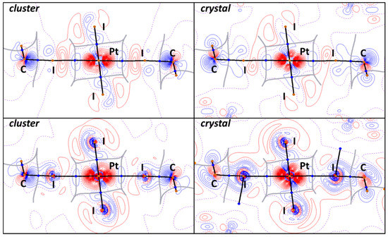 EDD projections for the I2HC−I1S∙∙∙Pt∙∙∙I1S−CHI2 XBs in cluster and crystal models with QTAIM black bond paths, brown nuclear, blue bond, orange ring critical points, and gray interbasin paths for calculations performed with GTH pseudopotentials (upper) or full-electron bases with relativism (lower). Contour lines were drawn from −0.02 to 0.02 e with 0.0005 steps; lines with negative values are red, lines with positive values are blue, and zero lines are purple and dotted.