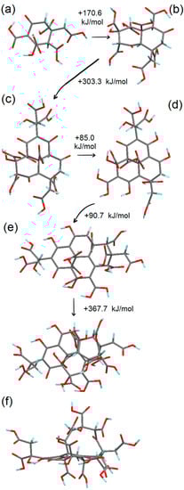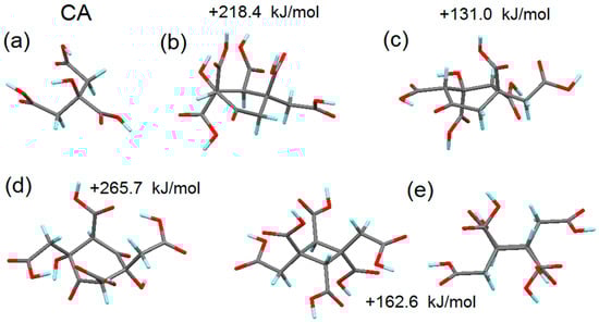 Note that in this reaction, –OH groups from carboxyl groups and the hydroxyl group attached to the carbon atoms in central parts of considered systems can participate. The sources of hydrogen are the –CH2– groups. Assembling the rings from two molecules of CA requires two simultaneous reactions described by Equation (1). Four different ring-containing structures can be produced from two molecules of CA. The first two structures correspond with the standard model but with different orientations of the carboxyl groups (Figure 1b,c). The significant difference in the formation energies demonstrates the importance of the contribution from the attraction and repulsion of various groups (–OH, –COOH, –CH2–COOH) on the ring’s edges. In addition to the structures formed by the conventional route, two other structures with carbon rings can be formed (see Figure 1d,e). Note that the enthalpy of the formation structure with four atom rings is only slightly higher than the energy of the most energetically favorable structure shown in Figure 1c (162.6 kJ/mol vs. 130.0 kJ/mol). The difference in the enthalpies of the formation of these structures is much smaller than the energies required for the formation of the other two structures. Thus, we will only consider in the following modeling the structures shown in Figure 1c,e. The formation of all structures shown in Figure 1a–d corresponds with the appearance of C=O groups on the edges of the carbon ring. This result agrees with the experimentally detected appearance of the signatures from these groups in XPS spectra. The calculated energies required for the first step of the formation of CND from CA are positive, and the magnitudes of these energies are not negligible. This result agreed with the experimentally observed low yield of CND when only CA was used as a precursor. Since the first step with the products shown in Figure 1 was realized in the experiments, the calculated values of the enthalpies of the first step will be used as a benchmark to evaluate the possibility for the formation of CNDs in the following stages.