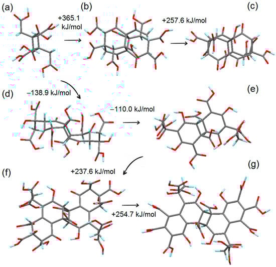 The next step of our work is a step-by-step simulation of the growth of graphenic structures by attachment of the following CA molecules to the most energetically favorable co-product of the first step of the analyzed process (Figure 1c). The addition of the following CA molecule to this structure via the two reactions described by Equation (1) doubles the number of carbon rings in the product (see Figure 2a,b). The energy required for this step is almost the same as that required for the formation of the structure shown in Figure 1e. The attachment of the following CA molecules also leads to the increase in the number of carbon rings in the structure (see Figure 2c). Still, the energy cost of the reaction is almost twice as high as that of the previous step. One of the reasons for this high energy cost is the contribution of the energy cost from the distortion of carbon rings. In the structures shown in Figure 1b–e and Figure 2a–c, all carbon atoms in these rings, except those belonging to carbonyl (C=O) groups, have sp3 hybridization. This hybridization corresponds with the deformation of the rings, which is energetically costly in polycyclic aromatic structures (for a detailed discussion, see Ref. [54]).