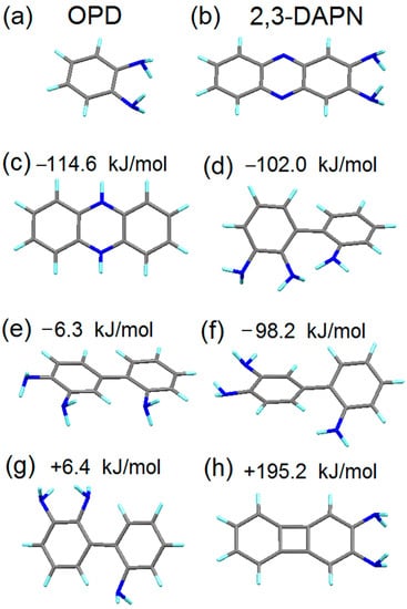 Optimized atomic structure of OPD (a), 2,3-DAPN (b), and products of the interaction between two OPD molecules with corresponding values of the enthalpies of the formation (c–h). The carbon atoms are shown in gray, nitrogen in dark blue, and hydrogen in cyan.