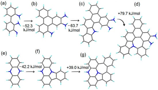Amino groups of the structure shown in Figure 5d can participate in the reactions described by Equation (3). This reaction is also energetically favorable and increases the number of aromatic rings (see Figure 5a,b). The covalent attachment of the following OPD molecule is also energetically favorable. Still, during this step, the increase in the number of aromatic rings also leads to the formation of a nitrogen-containing pentagonal structure (see Figure 5c). Note that the structure obtained in the process shown in Figure 4a has –NH–, which can participate in the reaction described by Equation (4). Our simulation results demonstrate that for both initial structures, energetically favorable reactions lead to the transformation of –NH– centers to the parts of pentagonal rings (see Figure 5e,f). Note that the enthalpy of simulated reactions is lower than that of almost all reactions corresponding with the polymerization of OPD-based structures (Figure 4e–h). Thus, “graphitization” must be considered not as the reaction following polymerization, as proposed in some studies [36], but as a concurrent process. To estimate the rates of these two processes, we calculated the probabilities of both processes using the Boltzmann equation with energies from Figure 5a–c for graphitization and from Figure 4d,f for polymerization. Results of the calculations demonstrate that at 200 °C, the rates of these processes are almost the same (the estimated ratio of the products of polymerization and graphitization is 0.52:0.48). The attachment of the following OPD molecule near nitrogen-containing pentagons forms carbon heptagons (see Figure 5d,g). Contrary to the previous reaction steps, the enthalpy of the former step is positive, but the magnitude of the enthalpy is moderate. Thus, increasing the temperature of the reaction can provide the formation of the N-containing pentagon–heptagon pairs shown in Figure 5d,g. The effect of the synthesis temperature of CNDs from OPD had been experimentally observed by Yulong An et al. [35]. Note that the similarity between the energies and atomic structures of the products suggest that reactions shown in Figure 5 can be realized at any stage of the formation of graphenic systems from OPDs and explain the valuable amount of graphitic nitrogen centers reported in almost all experimental studies summarized in Table 1. Another conclusion from the similarity between the energies and structures discussed in this paragraph is a possibility for the articulation of the general approach to the prediction of the wireframe atomic structures of CNDs based on the chemical composition of the reactants.