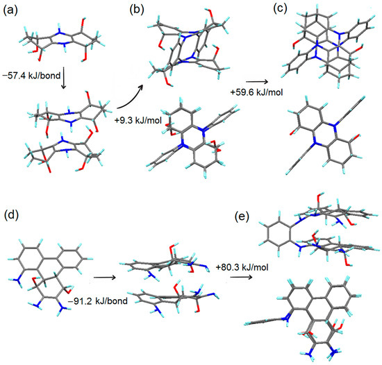 Optimized atomic structures of OPD-based systems before and after the formation of non-covalent bonds between neighboring aromatic layers (a,d), formation of covalent interlayer bonds (b,c,e), and corresponding enthalpies of the processes. Panels (b,c,e) show side and top views of the simulated atomic structures.