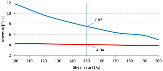 Rheology of the pastes for screen printing as a plot of viscosity (Pa∙s) over shear rate (1/s). Displayed are: LOCTITE® ECI 1010 (blue curve); PMMA-based silver paste (red curve).