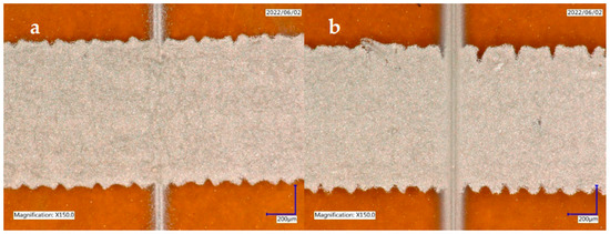 In hybrid connections, where the bottom layer was screen printed, the peak from AJP printed lines is significant. Due to leveling problems with the PMMA-based silver paste described earlier, one-layer prints can hardly be distinguished on the profile. However, the four-layer AJP prints proved to be well-recognizable on the surface of the screen prints (Figure 12).