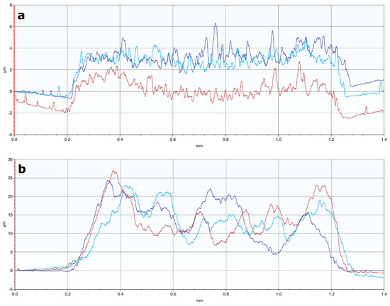 Profiles of the screen-printed layers’ surface: (a) LOCTITE® ECI 1010 with good leveling resulting from lower viscosity; (b) PMMA-based silver paste with a noticeable leveling issue resulting from higher viscosity paste. Three samples of each paste were measured and displayed together (as differently colored plots on each subplot).