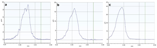 Profiles of AJP printed lines: (a) 1-layer print, height: 9 µm; (b) 2-layer print, height: 17 µm; (c) 3-layer print, height: 37 µm.