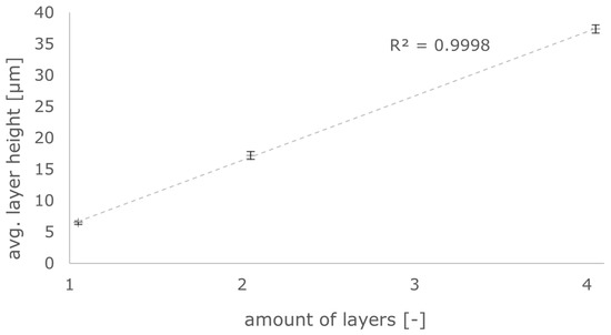 AJP lines were deposited on the Kapton substrate. One-, two-, and four-layer prints were compared (Figure 9). A linear trend relation between the number of layers and the average maximum height of the print measured was observed (Figure 10). This means that the printing process was conducted with the correct printing parameters.
