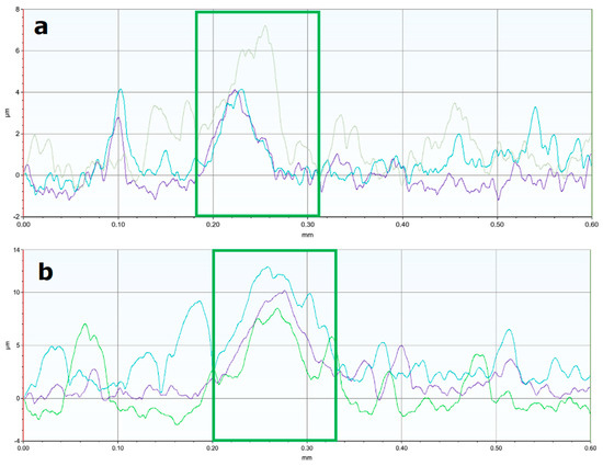 Profiles of hybrid-printed connections with 4-layer AJP printed lines on top of ECI 1010 silver paste. (a) hybrid connection with double annealing after each print; (b) hybrid connection with a singular annealing process after both prints. Three samples of each paste were measured and displayed together (as differently colored plots on each subplot). The green box points the area where the AJP layer is located.