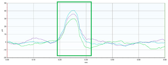 Profiles of the hybrid connection with a 4-layer UTD40X print on top of the PMMA-based silver paste (3 measurements). The AJP peak of around 30–40 µm is well recognizable against the screen-printed layer. Three samples of each paste were measured and displayed together (as differently colored plots on each subplot). The green box points the area where the AJP layer is located.