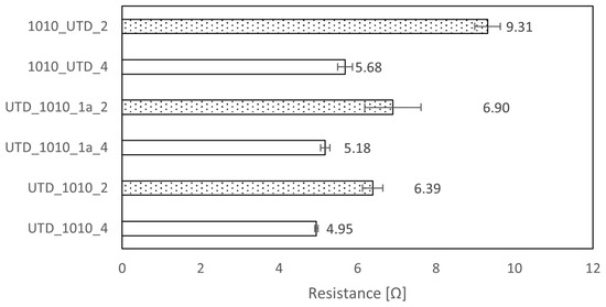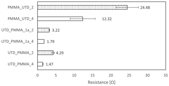 The combination of UTD40X AJP ink with the PMMA-based screen printing silver paste (Figure 13) presented the lowest resistance of all researched connections for the connections with four-layer AJP ink on top of the PMMA paste (UTD_PMMA_4). The resistance values of 1.47 ± 0.06 Ω for the connection UTD_PMMA_4 and 1.79 ± 0.02 Ω for the connection UTD_PMMA_1a_4 provide the reason to believe the connections were properly established. The connection PMMA_UTD_4, with PMMA-based paste printed on top of the four-layer AJP lines, has a significantly higher average resistance of 12.32 ± 3.42 Ω than the other connections. This may result from the fact that AJP ink being deposited on top of the paste has a greater opportunity to establish contact with the silver paste while annealing the ink layer. The same is not true for the connections with paste applied as the top layer, as it is deposited on an already sintered AJP printed line with no polymeric carrier, therefore having difficulties in establishing a new connection. The spread of the results is also significantly larger. This is presumably due to less stability and control during the annealing process.