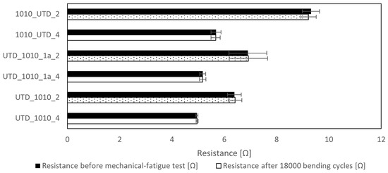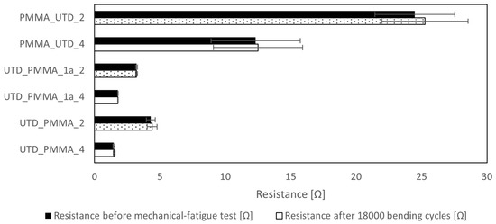 Results of the average resistance values before and after the mechanical fatigue tests for hybrid connections with PMMA-based paste and UTDots Ag40X AJP ink. The bars corresponding to the connections with the two-layer aerosol print have been dotted. A description of the electric measurements method can be found in Section 2.1.