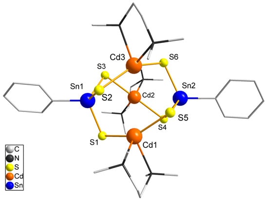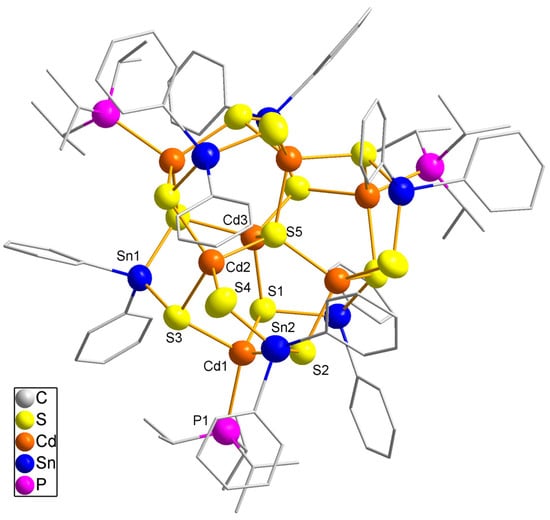 Compounds featuring a Cd-S-Sn structure motif are rare in the literature. To the best of our knowledge, there are only the purely inorganic, supertetrahedral cluster Cs10[Cd4Sn4S17] [1] and [{(C6F5)3Ge}2Cd{S(SnEt3)2}] [2]. Suitable starting materials for the solution-based synthesis of cadmium tin sulfido complexes are cadmium chalcogenolate complexes which are known in the literature with different ligands coordinating the Cd2+ ions, e.g., tmeda-stabilized chalcogenolates [3,4,5,6,7]. Moreover, tertiary phosphine ligands have been used to synthesize complexes such as [Cd4(SPh)6(PPh3)4](ClO4)2 [8], [Cd(SEt)(S2CSEt)(P{c-hex}3)]2 [9] or [Cd17S4(SH)2(SPh)24(PPh3)2] [10] (Et = C2H5, Ph = C6H5, c-hex = cyclo-C6H11) and also a mixed zinc-cadmium thiophenolate complex [11].
