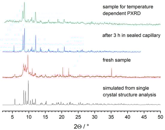 X-ray diffraction of a freshly prepared powder sample of 2 showed mainly broad reflections matching the simulated pattern based on single-crystal structure data in reflection positions and intensities (Figure 4). Repeated measurements of the same sample resulted in a continuous broadening of the reflections. After approx. 4 h, the reflections became sharp again, and the diffraction pattern did not change any more. The origin of this behavior might be the loss of DME solvent molecules.