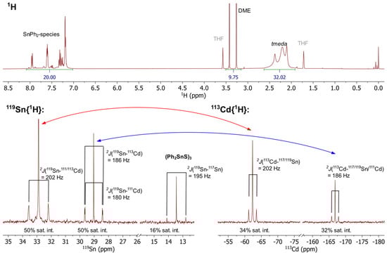 1H, 119Sn{1H} and 113Cd{1H} NMR spectra of 2 recorded at 26 °C in THF-d8. The intensity ratios of the main and satellite signals in the 119Sn and 113Cd spectra are given below the spectra.