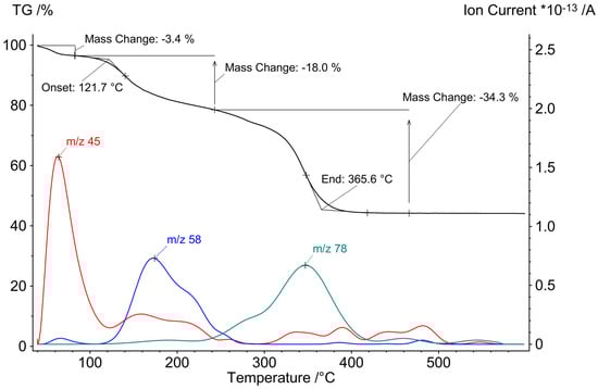 TG curve and selected ion current curves for the thermolysis of 2 at temperatures up to 600 °C (* means “multiplied with”).