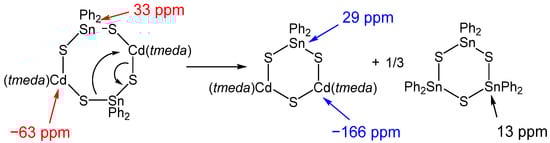The above findings allow the conclusion that an exchange reaction (Scheme 3) may occur in solution. The presence of 2 is most likely and assigned by the signals marked in red in Figure 5, as each tin atom is in the neighborhood of two cadmium atoms and vice versa. Due to the clear presence of (Ph2SnS)3, another cadmium-rich species must exist. The formation of a species such as [{(tmeda)Cd}2(SnPh2)S3] is possible and is in agreement with the NMR spectroscopy results. The lower satellite intensity of the 113Cd signal at −166 pm can be explained with a coupling of the 113Cd nucleus with one 117/119Sn nucleus and one magnetically nonequivalent 111Cd. The 119Sn signal clearly shows coupling with two 111/113Cd nuclei. Unfortunately, even at low temperature the three couplings with similar coupling constants cannot be resolved.