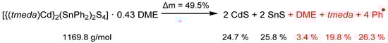 Complex 2 is a potential source of Cd, Sn and S in thermolysis reactions. The results of a simultaneous thermogravimetric experiment (TG) up to 600 °C are shown in Figure 6. The observed weight loss of 55.7% is higher than expected according to the schematic expected thermolysis reaction equation as shown in Scheme 4.