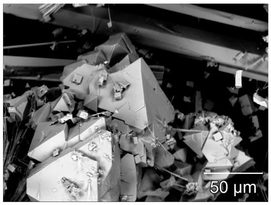 According to the literature, for the synthesis of La5F3[SbO3]4, the preparation of La5Cl3[SbO3]4 was carried out according to Equation (1) with the reactants lanthanum sesquioxide (La2O3 (656 mg, 0.336 mmol): ChemPur, 99.99%), lanthanum trichloride (LaCl3 (246 mg, 0.336 mmol): ChemPur, 99.9%), antimony sesquioxide (Sb2O3 (583 mg, 0.168 mmol): ChemPur, 99.9%) and as flux cesium chloride (CsCl (800 mg): Aldrich, 99.9%) at a temperature of 780 °C for a period of four days, followed by slow cooling to 660 °C and further keeping this temperature for four more days, and subsequent cooling to room temperature. Thereafter, the aqueous workup to remove the flux yielded a fibrous microcrystalline powder containing a few octahedrally shaped single crystals (Figure 1), which had the desired composition and could be further characterized by single-crystal X-ray diffraction.