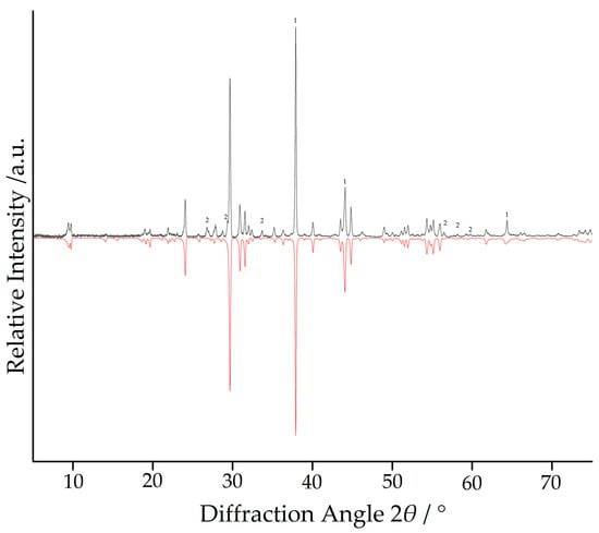 The sample of La5Cl3[SbO3]4 was measured in transmission geometry on a Rigaku SmartLab X-ray powder diffractometer (Rigaku, Tokyo, Japan) using Cu-Kα1 radiation. Figure 3 shows the powder diffractogram. It contains traces of CsCl and an unknown phase (marked with 2) in addition to La5Cl3[SbO3]4. Further reflections of elemental cubic aluminum (marked with 1) result from the measurement on an aluminum sample carrier.