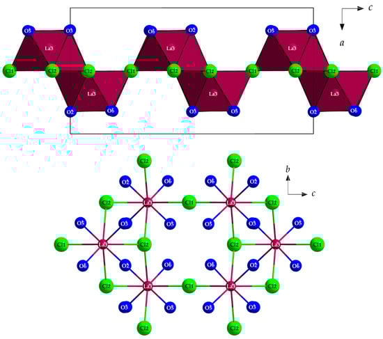 The coordination polyhedra around (La3)3+ show a different linkage pattern compared to those centered with (La1)3+ and (La2)3+. Namely, the linkage occurs once via the (Cl2)− anions, which edge-link the polyhedra along the b-axis, forming one-dimensional double strands. A quite similar bonding situation is found in the rare-earth metal(III) halide oxoarsenates(III) RE3X2[As2O5][AsO3] (RE = Y, Sm–Gd, Ho–Yb and X = Cl and Br) [3,25]. However, these chains are still corner-linked to each other via the (Cl1)– anions here, turning the double strands into a two-dimensional bilayer (Figure 6, top), which can be described with the Niggli formula {[(La3)O(Cl1)(Cl2)]6.5–}. The two different Cl– anions that contribute significantly to the linkage of the [(La3)O4Cl4]9– antiprisms are shown again in Figure 6 (bottom) in the centers of cationic coordination polyhedra, where the different coordination numbers of C.N.(Cl1) = 2 and C.N.(Cl2) = 3 are particularly prominent.