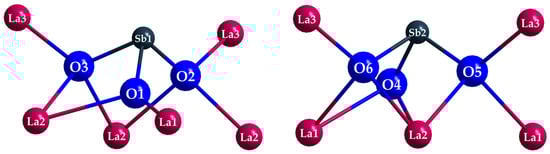 The crystal structure of La5Cl3[SbO3]4 exhibits two crystallographically distinct Sb3+ cations, both of which actuate a coordination number of C.N. = 3 with respect to oxygen atoms to form ψ1-tetrahedral [SbO3]3– anions with antimony–oxygen distances of d(Sb1–O) = 196–202 pm and slightly shorter ones of d(Sb2–O) = 187–199 pm (Figure 7). Literature comparison with typical Sb3+–O2− bond lengths reveals values of 198–202 pm for valentinite and senarmontite, the two naturally occurring crystalline modifications of antimony sesquioxide (Sb2O3), which are in good agreement [26,27]. With O–Sb–O angles from 83 to 105°, the deflection of the Sb3+ cations from the triangular oxygen plane of their trigonal-pyramidal [SbO3]3− anions amounts to 110–111 pm.