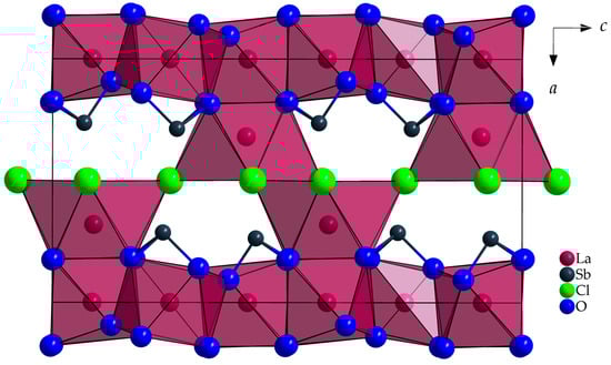 The analogously recorded powder X-ray diffractograms of La2Sb12O19Br4 and La2Sb12O19I4 are not shown, despite the fact that they also show the presence of the title compounds. Moreover, they document that these products do not occur in phase pure, which is already assumable by their formation reaction (Equation (2)), targeting the compositions LaSb2O4Br and LaSb2O4I. In the first case, there is strong evidence for the presence of La5Br3[SbO3]4 as a by-product, which most probably crystallizes isotypically with La5Cl3[SbO3]4. The formation of this compound with a molar ratio of La:Sb = 5:4 would explain the dominance of the La2Sb12O19Br4 phase (La:Sb ratio = 1:6) when a compound such as LaSb2O4Br (La:Sb ratio = 1:2) is planned to be synthesized. For the La2Sb12O19I4 case, there are many extra reflections in the powder X-ray diffractogram, which originate from a cesium-containing by-product with the composition CsI4La2Sb8.333O14 (monoclinic, C2/m; a ≈ 2325 pm, b ≈ 420 pm, c ≈ 1300 pm, β ≈ 96.5° for Z = 2) crystallizing isotypically with RbI4Nd2Sb8.333O14 [20,21] after the incorporation of some CsI from the flux (Equation (2)). As the empirical formula Cs2I8La4Sb16.667O28 for Z = 1 already suggests, there are strong structural similarities to La2Sb12O19I4, which will be shown in an upcoming publication soon.
