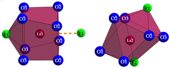 Bicapped square hemiprism [(La1)O8F(1+1)]15− (left) and bicapped trigonal prism [(La2)O6F2]11− (right) in the tetragonal crystal structure of La5F3[SbO3]4.