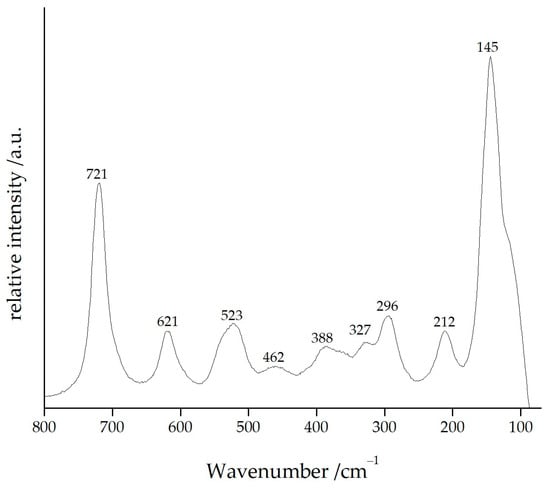 A single-crystal Raman measurement was performed for further characterization to prove the relationship to the rare-earth metal(III) bromide oxoarsenates(III) RE5Br3[AsO3]4 (RE = Pr, Sm, Eu, Tb) [2,3,6]. The spectrum recorded at an excitation wavelength of λ = 638 nm is shown in Figure 10.