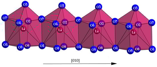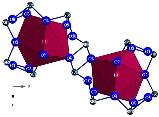 The capped square hemiprisms [LaO9]15− are located within these “double-halfpipes”, where each oxygen atom of every [LaO9]15− polyhedron is also a component of the antimony-oxygen “double-halfpipe” arrangement (Figure 13).