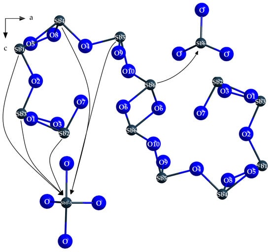 Tubular or semi-tubular arrangements of antimony and oxygen are not so rare, especially when heavy anions (X– = Br− and I−) occur in antimony(III) oxide halides, such as Sb8O11X2 (X = Cl–I) [33,34,35], Sb5O7I [36,37,38], and Sb3O4I [39]. Even with additional alkali-metal cations, they persist, for example, in the systems AI4RE2Sb8.333O14 (A = K–Cs; RE = Y, Pr–Tm) [6,20,21].